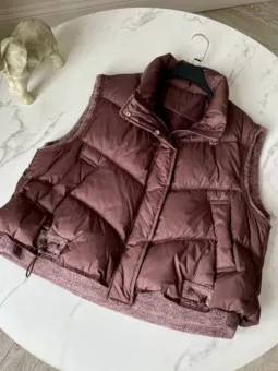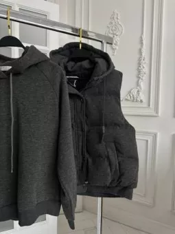 роскошная жилетка комбинированная вязкой цвета: черный шоколадный серый длина: по спинке 62 см карманы рабочие размер м (42-46) l(46-50) ткань:курточная полностью на подкладке наполнитель пух перо радуем вас новой коллекцией весна цена; опт 3100