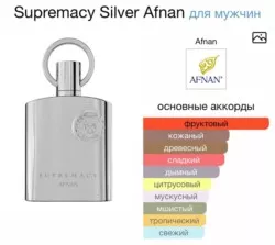 supremacy silver afnan это аромат для мужчин, он принадлежит к группе древесные цветочные мускусные. supremacy silver выпущен в 2013 году. парфюмер: imran fazlani. верхние ноты: ананас, черная смородина, бергамот и яблоко; средние ноты: береза, пачули, марокканский жасмин и роза; базовые ноты: мускус, дубовый мох, серая амбра и ваниль