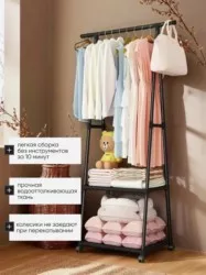 вешалка для одежды имеет ограничители по краям, чтобы плечики не соскальзывали. внизу напольной вешалки предусмотрена полочка, на которой можно расположить коробки с обувью и различными домашними аксессуарами. сбоку предусмотрены пластиковые крючки, на них можно вешать сумки, шляпы, зонты. компактная напольная вешалка прекрасно впишется в интерьер любой квартиры, дома, офиса, дачи, ее можно поставить на кухне или в спальне. вешалка легко разбирается и собирается, ее легко можно переставить в удобное место. наша вешалка станет прекрасным органайзером для одежды и обуви.