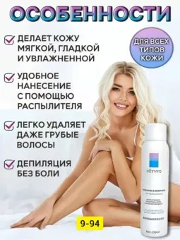 cпрей для депиляции detvfo - это обогащенный витаминами спрей, который растворяет волосы до корней без боли и какого либо дискомфорта. средство делает кожу полностью гладкой и увлажненной. попробовав однажды спрей detvfo, вы откажетесь от бритья и болезненной восковой эпиляции навсегда. хватает более чем на 30 применений.