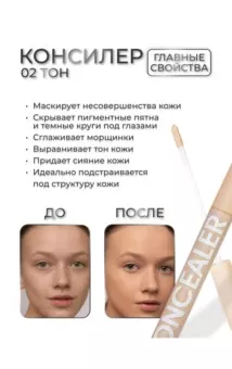 наш консилер плотного покрытия отлично скрывает недостатки и мелкие дефекты кожи, делая ваш макияж безупречным. специально разработанный консилер для глаз эффективно скрывает темные круги и отеки под глазами, придавая вашему взгляду свежий и отдохнутый вид.