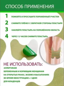 представляем вашему вниманию чудодейственный коленный патч - пластырь от различных видов боли и дискомфорта в суставах и мышцах, в том числе в ногах, в коленях, в стопах или локтях, шее или пояснице и других частей тела. также пластырь можно использовать от головной боли и при болях в спине. патч довольно распространен в китайской медицине, он улучшает микроциркуляцию крови в месте наложения, активизирует обмен веществ. обезболивает, согревает, оказывает противоотечное и противовоспалительное действие, рассасывает кровоподтеки, снимает боль в мышцах, мышечные спазмы и воспаления в суставах. пластырь имеет исключительно натуральные компоненты - трехлетняя полынь обладает противовоспалительными свойствами, укрепляет стенки сосудов, оказывает антисептическое действие, белая горчица