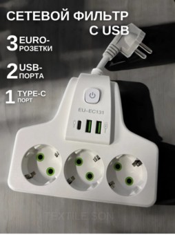 сетевой фильтр на 3 euro розетки, 2 usb порта, 1