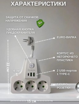 туре-с порт. с предохранителем (кнопка) от скачков энергии. белый цвет. удлинитель с euro вилкой. мощность 2500вт, и 10а