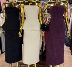 элегантная двойка выполненная из фактурного твида с мелкими мерцающими пайетками. корсет красиво подчеркивает линию талии и создает утонченный силуэт, а строгая юбка добавляет образу женственности и шарма.