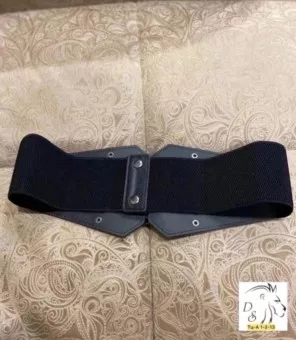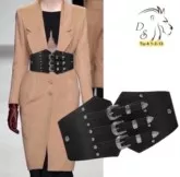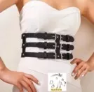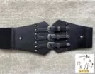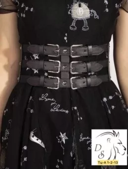 эффективный образ поможет создать широкий пояс в виде корсета. чтобы выделить талию его надивают поверх платья или рубашки. спереди модель декорирована вставками из экокожа и украшена пряжками .пояс застегивается сзади два кнопки.