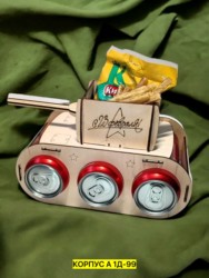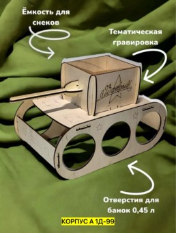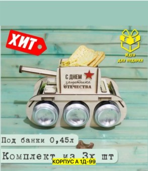 сувенир, дерево корпус а 1д-99 цена штучно: 100руб высота - 14,5см, танк из фанеры поставляется в разобранном виде. диаметр отверстий подходит под банку 0,45л. длина - 25см. без выбора цвета. размеры: цена оптом: 100руб (упак. 1шт=100руб) ширина - 13,5см,